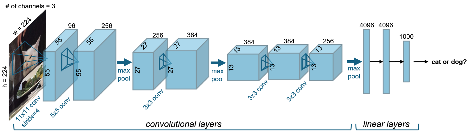 Figure 4.1: Alexnet architecture, adapted from1. This early neural network first demonstrated the capabilities of deep learning when trained on large datasets.