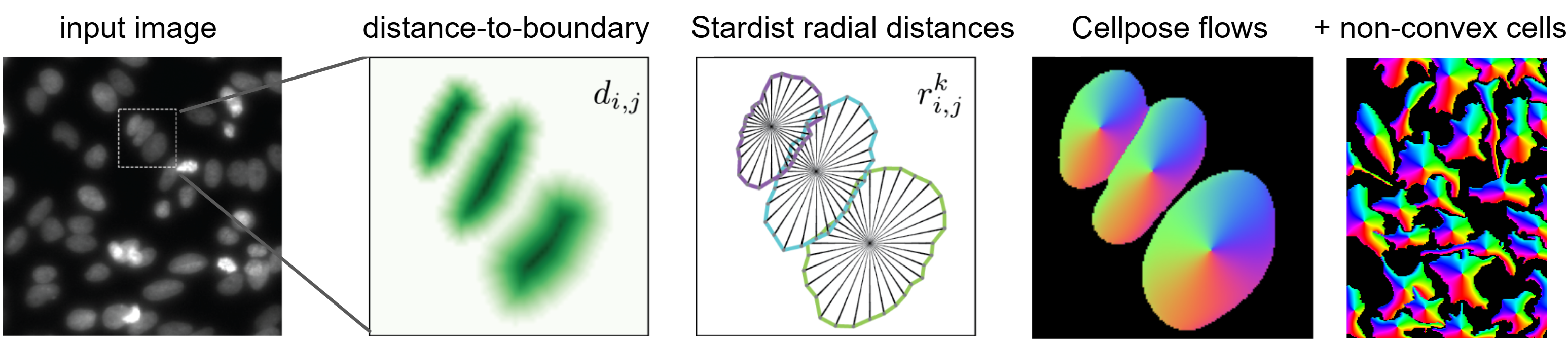 Stardist21 extends this approach by computing the distance-to-boundary along multiple fixed rays emanating from each pixel in an object, which can then be used for reconstruction of convex objects22. Cellpose creates a different type of representation from gradients indicating the direction towards the cell center, and tracks the gradients to reconstruct the segmented objects from the fixed points of the dynamics10. This representation helps prevent merges by having strong differences in gradients in boundary areas between two objects, and is sufficiently flexible to be used for non-convex cellular shapes. Other examples of auxiliary functions include local shape descriptors (LSDs), which include other global features like the size of the object, which can be useful for electron microscopy segmentation of neurons with long processes23.