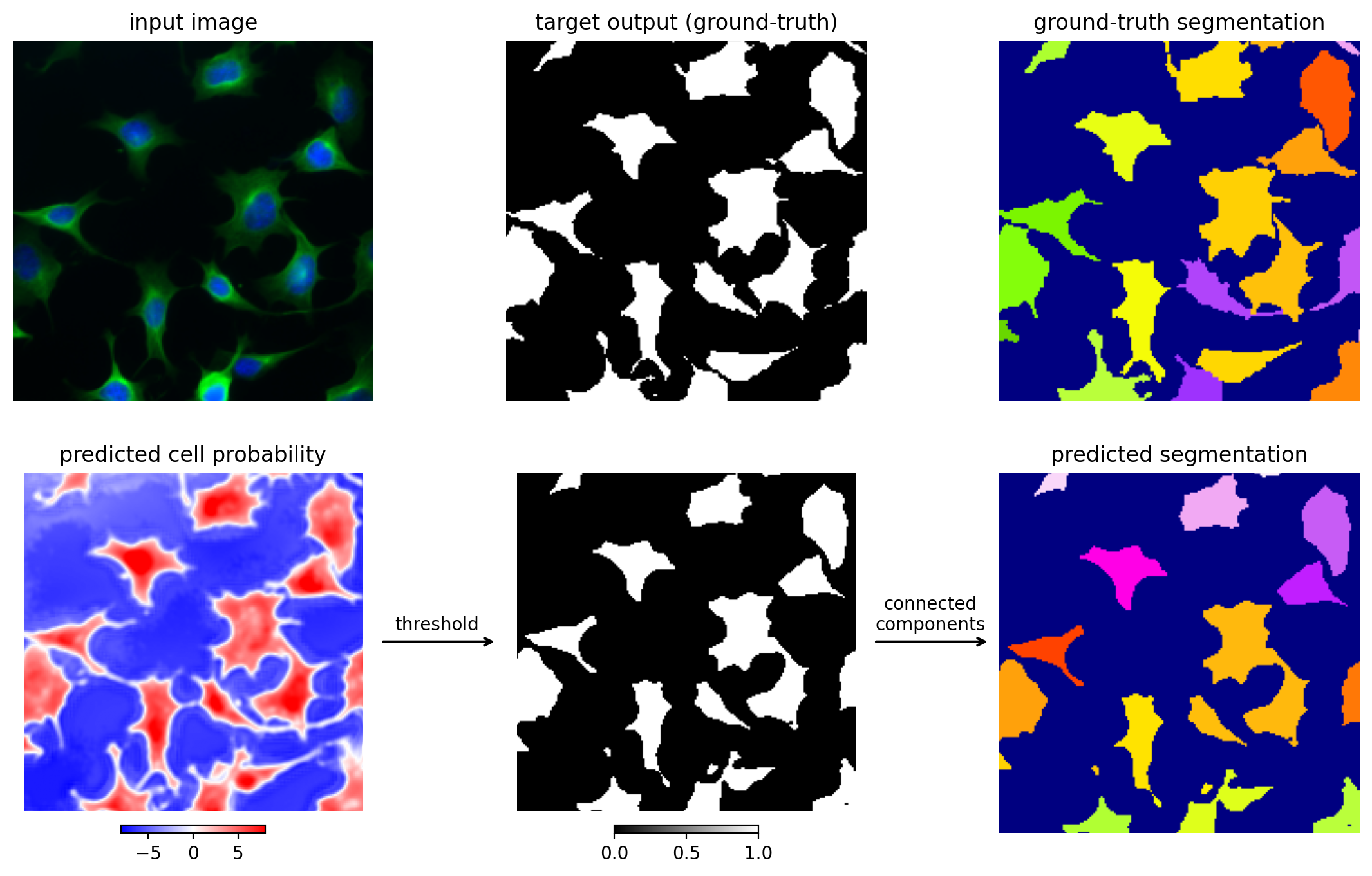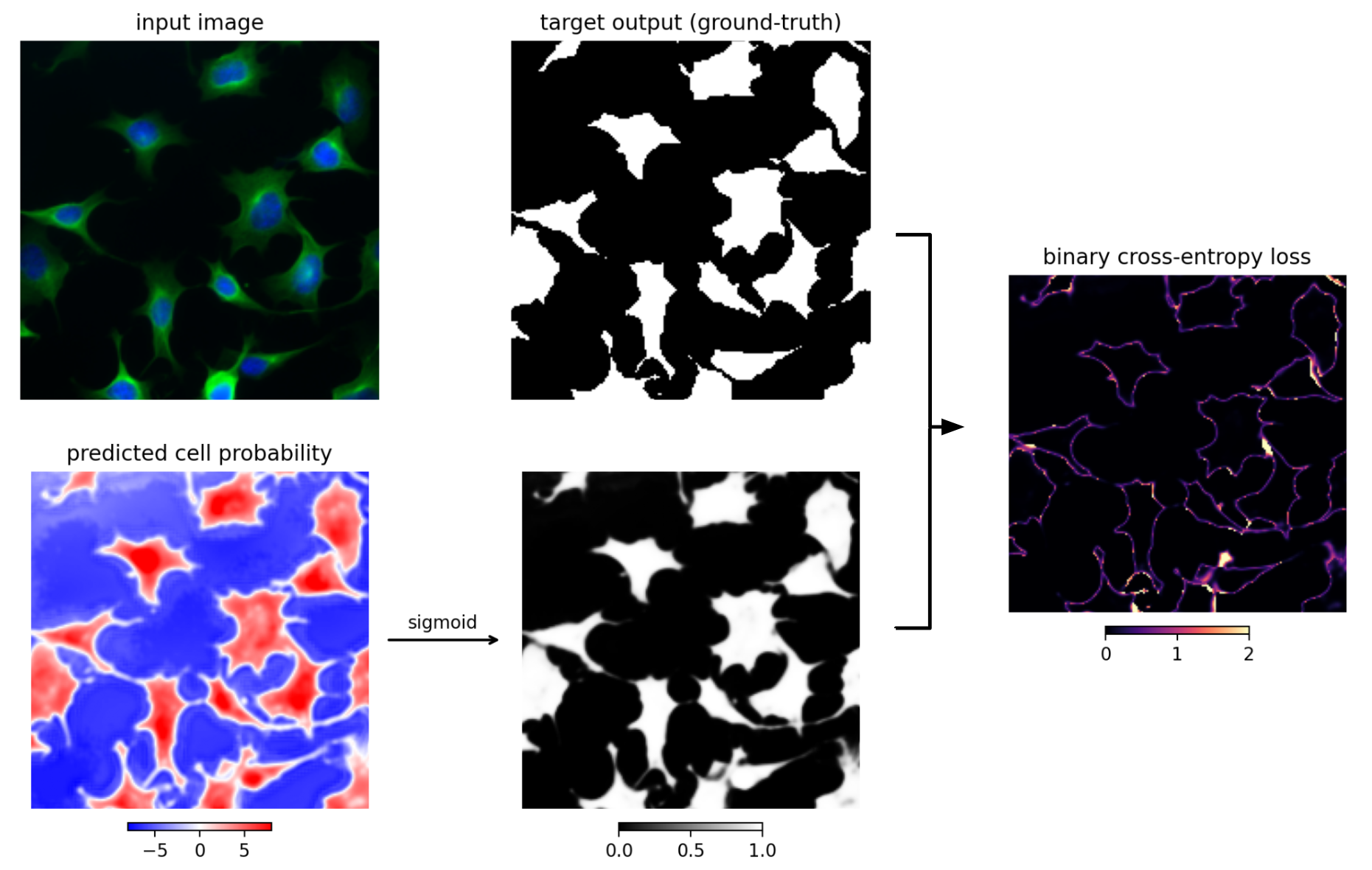Figure 4.12: An image (upper left) is input to a u-net trained to predict cell/not cell pixels. The output of the network is the predicted cell probability image (bottom left). A sigmoid is applied to the cell probability (middle bottom), and compared to the ground-truth cell probabilities (middle top). The comparison is performed using the binary cross-entropy loss per-pixel (right).