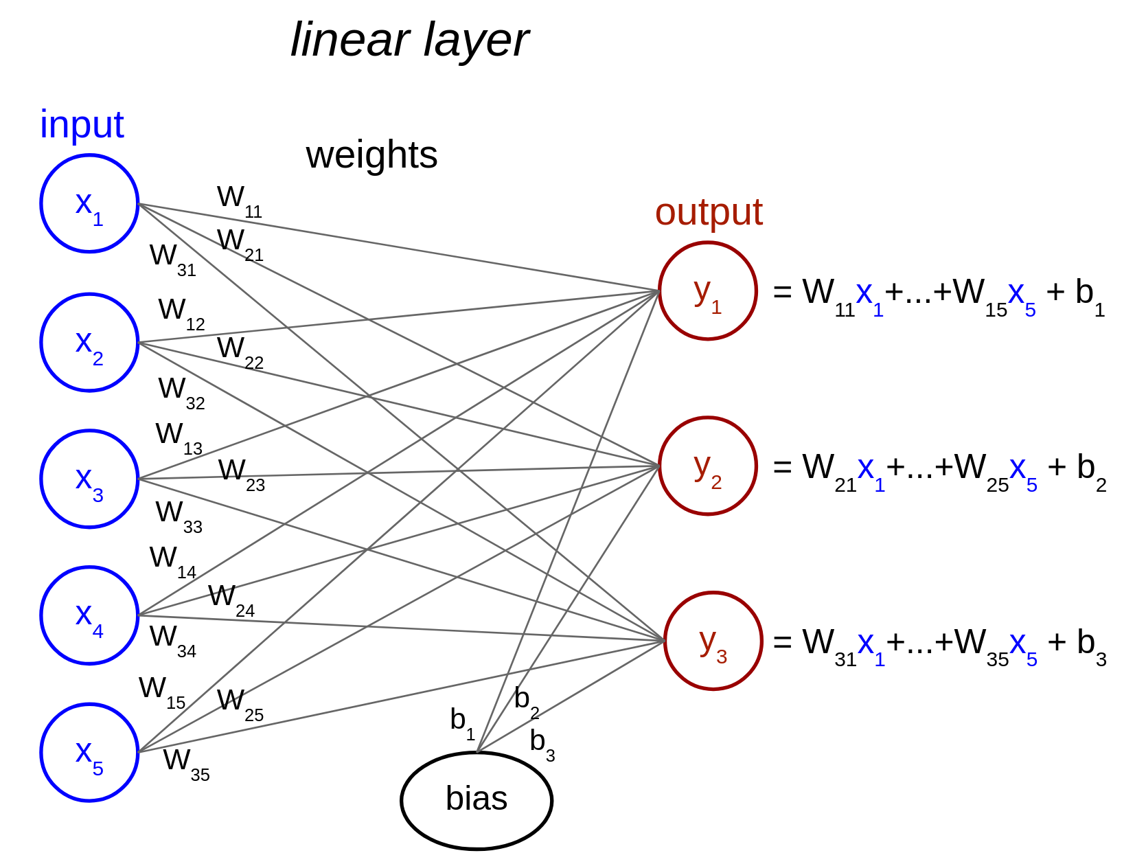 Figure 4.3: Illustration of a linear layer with five input features and three output features.