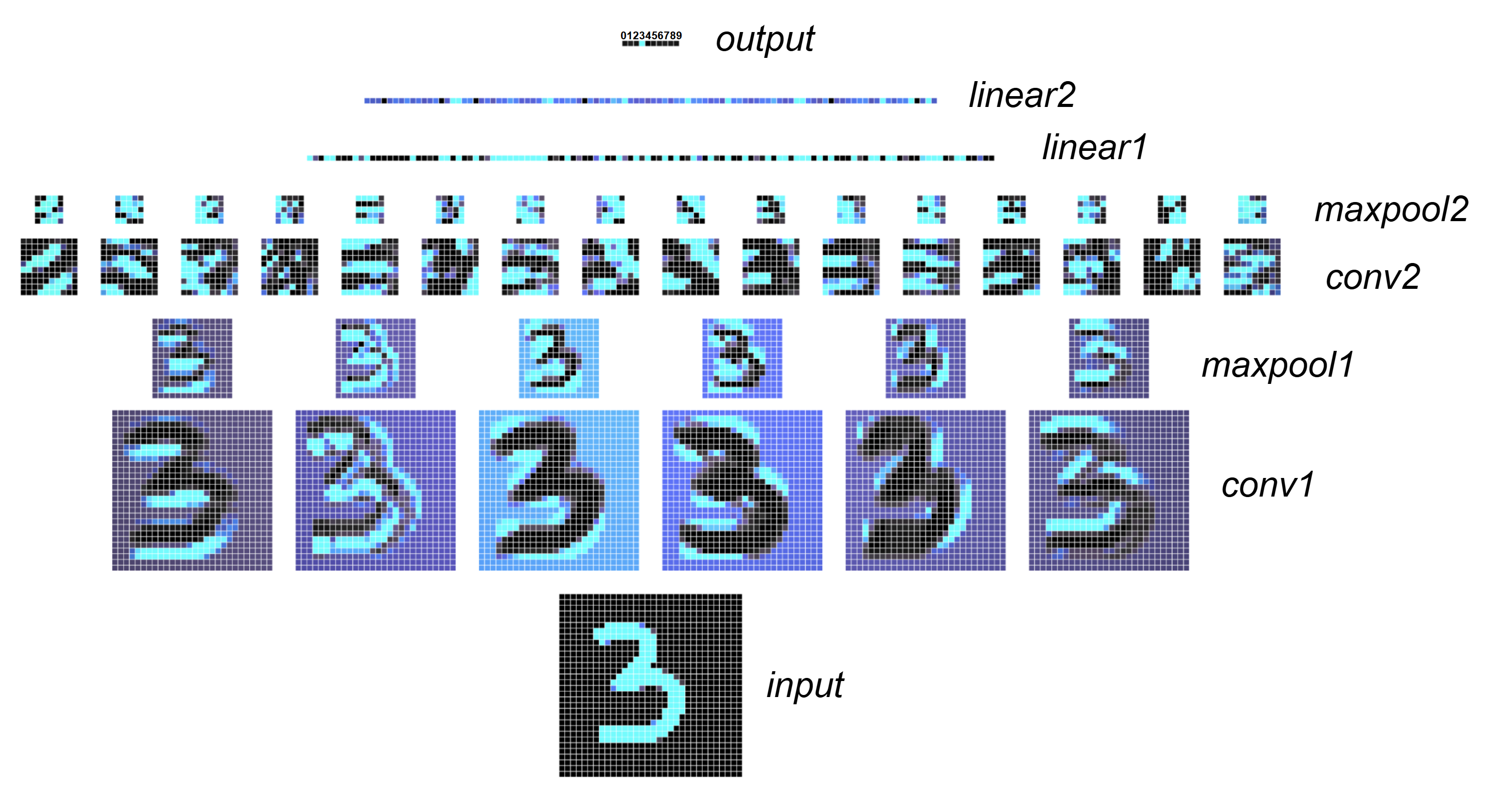 If we apply several convolutional and pooling layers, we end up with an output which is smaller in resolution than the input. In Figure 4.9, we show an example of such a network, that has been trained to classify the handwritten digits of the MNIST dataset6. The activations of the units in the network across layers are visualized: