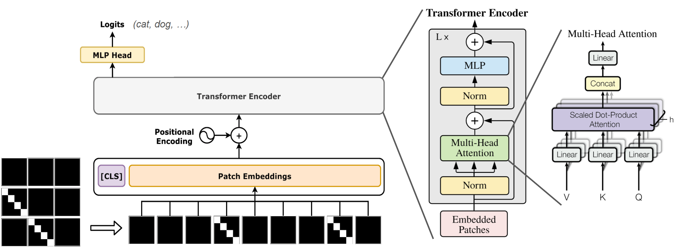 Figure 4.10: Vision transformer architecture. Originally invented for language modeling12, transformers were then adapted for image processing11. The critical innovation in transformers is the self-attention block (left illustration from PyTorchStepByStep).