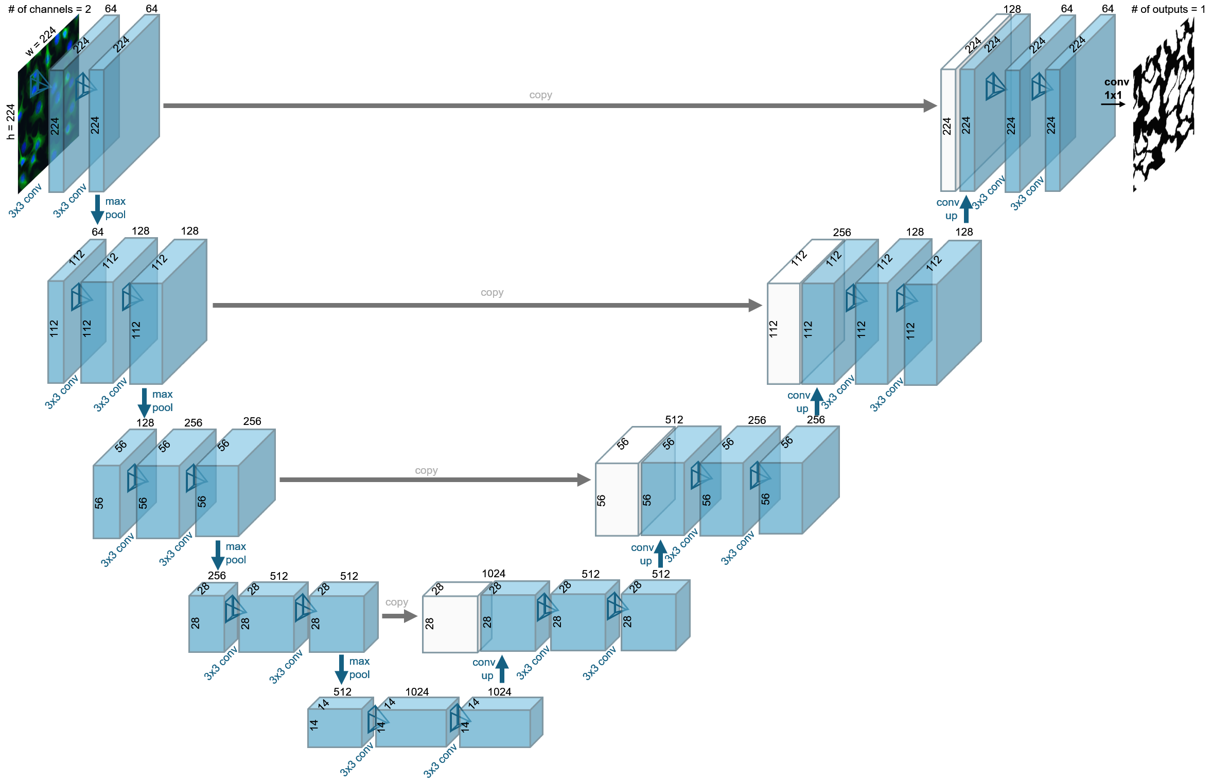 Figure 4.2: U-net architecture, adapted from2. This neural network was revolutionary for biological analysis, in part due to the image-sized outputs and dense skip connections between layers on the downsampling and upsampling pass.