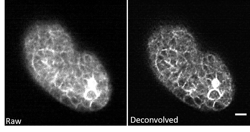 Since the output TIFF file is a two-channel ImageJ Hyperstack containing raw and restored images, we can easily compare the deconvolved effects.