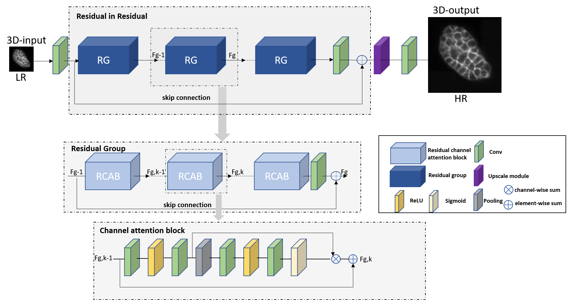 Residual Channel Attention Networks (RCAN1), are deep learning architectures initially designed for 2D super-resolution images, leveraging residual learning and channel attention mechanisms to prioritize high-frequency details. Their hierarchical “residual-in-residual” structure and adaptive channel-wise feature scaling enable superior recovery of fine textures in natural images. Researchers adapted RCAN for 3D fluorescence microscopy data to address challenges in volumetric imaging. This 3D-RCAN2 implementation modifies the original architecture by replacing 2D convolutions with 3D operations, optimizing parameters (e.g., residual groups, channel dimensions) for GPU efficiency, and processing spatiotemporal (4D) data. This adaptation enables denoising and resolution enhancement of volumetric time-lapse microscopy, achieving prolonged live-cell imaging with minimal photo bleaching. By training on paired low/high-quality datasets (e.g., confocal \(\leftrightarrow\) STED or iSIM \(\leftrightarrow\) expansion microscopy), 3D-RCAN restores sub cellular structures, improves lateral and axial resolution, and outperforms existing networks (e.g., CARE)3) in fidelity metrics (e.g., SSIM4 or peak signal to noise ratio). Its applications span fixed and live-cell studies, offering a versatile tool to overcome trade offs between spatiotemporal resolution and phototoxicity in fluorescence microscopy.