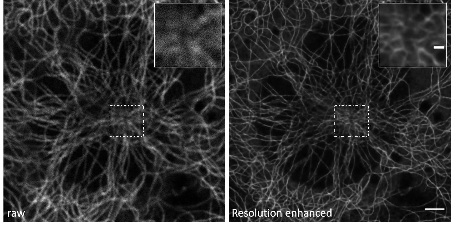 Raw data: The “raw” data here refers to the original confocal microscopy images of the fixed mouse embryonic fibroblast (MEF) cells, specifically focusing on the microtubules. These images are acquired directly from the confocal microscope without any further processing or enhancement. They represent the initial, unaltered state of the microtubule structures as captured by the confocal microscope.
