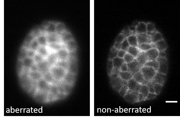 3D-RCAN effectively corrects system-induced optical aberrations in GFP-labeled C. elegans embryos. The de-aberrated image restores spatially ordered structures obscured by asymmetric blur in the raw data, while suppressing background granularity and enhancing signal-to-background contrast.
