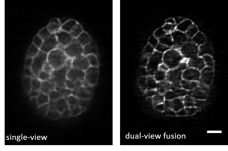 Input (Raw): Low-quality, blurry 3D images with PSF such as single-view volumetric images acquired via diSPIM (0.8 NA \(\times\) 0.8 NA optics), with voxel size 0.1625 \(\times\) 0.1625 \(\times\) 1.0 µm