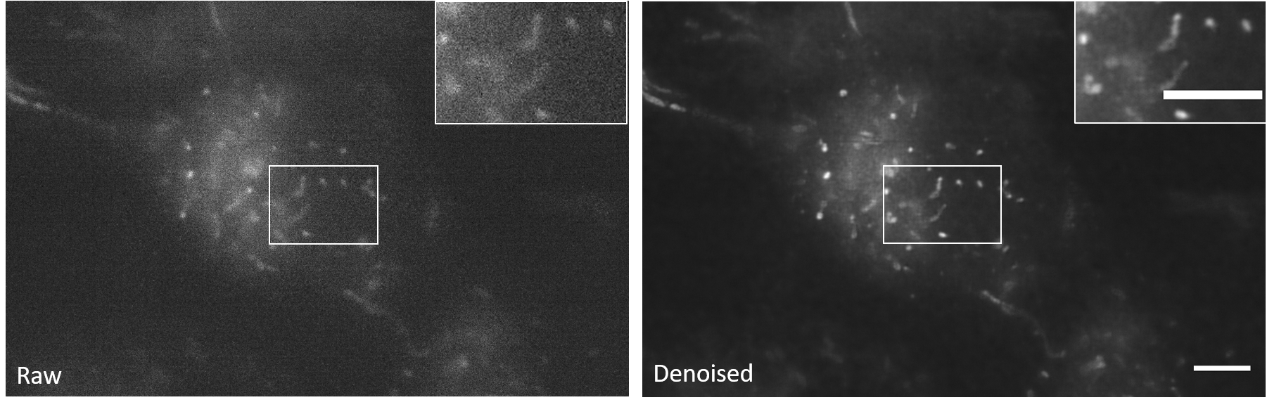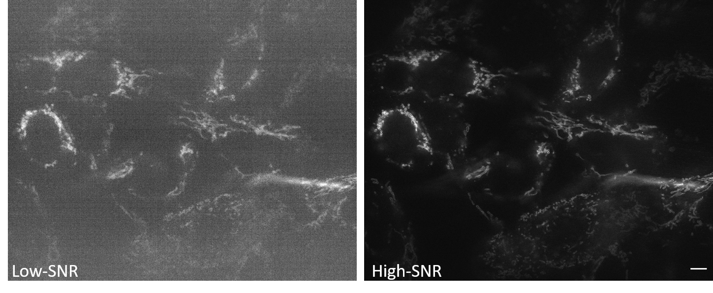 Low-SNR Data: Noisy images. Here we use low signal-to-noise ratio data obtained by imaging mitochondria labeled with mEmerald-Tomm20-C-10 in living U2OS cells using instant structured illumination microscopy under low illumination intensities.