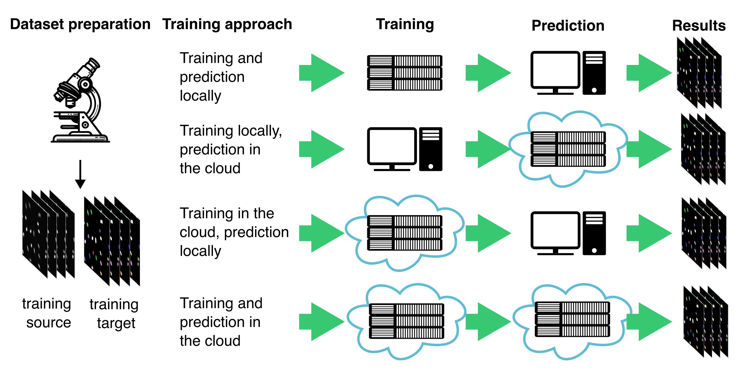 Training in the cloud, prediction locally enables researchers to take advantage of powerful cloud GPUs for model development, while keeping inference close to the data source (e.g., a microscope workstation or in case of sensitive data).