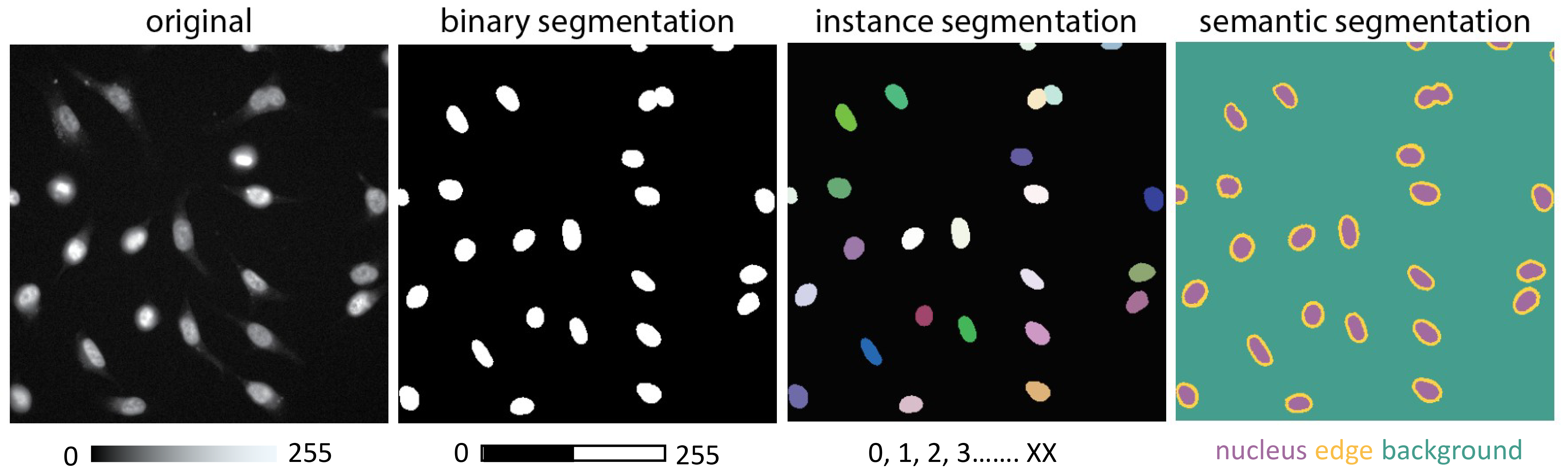 Semantic segmentation: This segmentation strategy involves labelling every pixel in an image according to its class, such as “nucleus,” “cytoplasm,” or “background.” Unlike instance segmentation, semantic segmentation does not differentiate between individual objects within the same class. This method is beneficial for analysing the spatial relationships and distribution of various cellular components.
