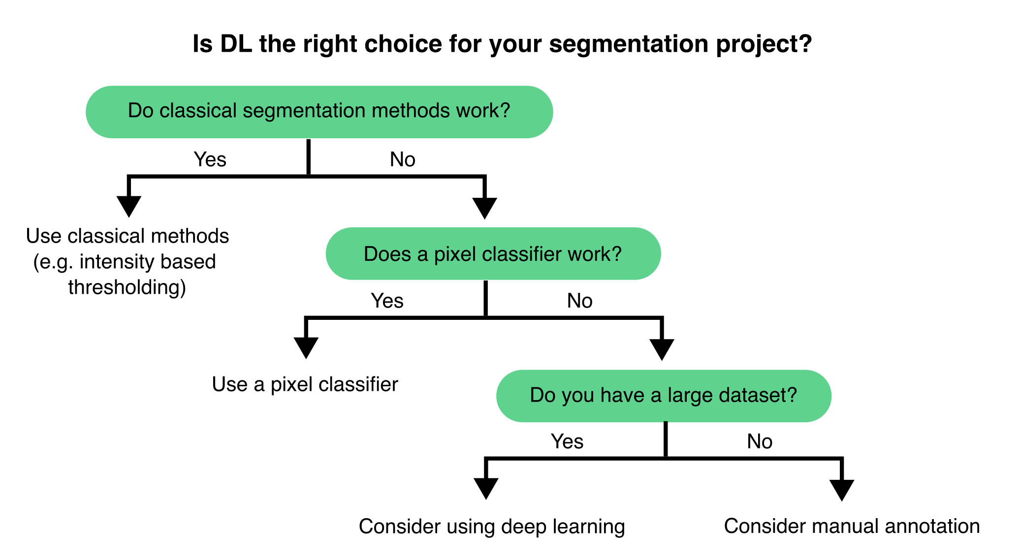 Consider whether your segmentation solution is meant for a specific experiment or needs to generalise across various imaging techniques, sample types, or experimental conditions. Additionally, evaluate the volume of data to analyse, the feasibility of manual analysis, and the resources available to create a tailored image analysis pipeline. Avoid overengineering a solution when a simple analysis could provide the answer you seek.