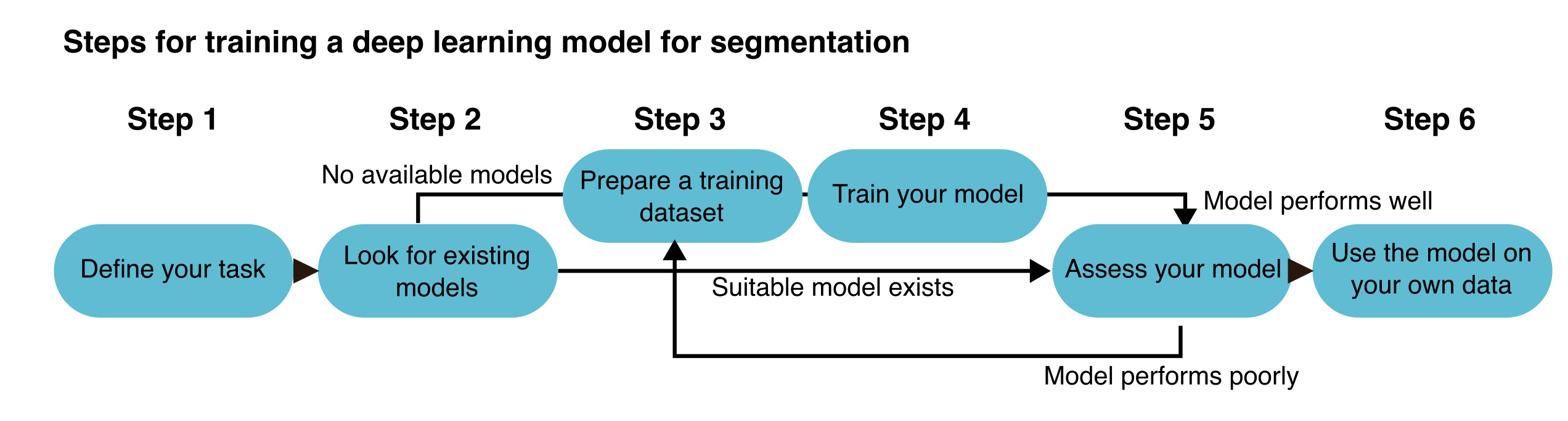 The process starts by clearly defining your task (in this example, segmentation) and selecting the right DL approach (Step 1). Next, evaluate whether any existing pre-trained models can be used directly on your data or adapted for use (Step 2). If additional training is required—either from scratch or through transfer learning—prepare an appropriate training dataset that reflects your segmentation problem (Step 3). Then, train your model using the prepared dataset (Step 4) and thoroughly evaluate its performance using validation or test data (Step 5). Based on the results, you may need to refine the model by adjusting hyperparameters, improving annotations, or expanding the dataset. Once the model performs satisfactorily, it can be used to segment new, unseen data (Step 6). We will now discuss each step in more detail.