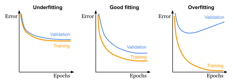 - Good fitting: Both training and validation losses decrease, with the validation loss slightly higher (worse) than the training loss, which is expected. This represents the ideal scenario.