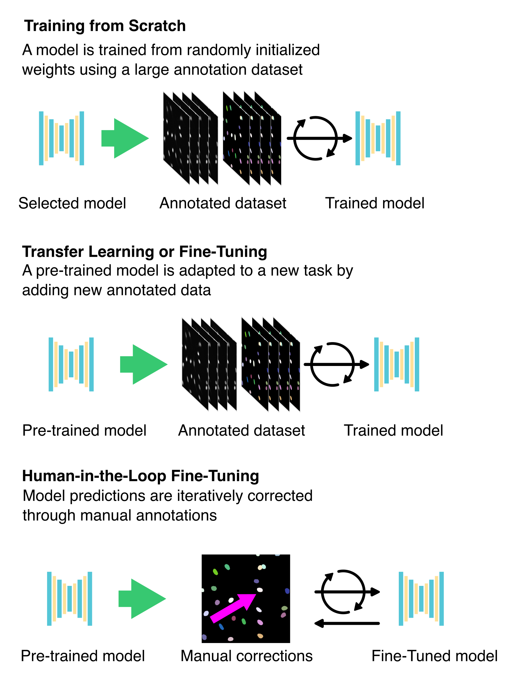 Iterative fine-tuning is an interactive approach that combines model prediction with human annotation (see Section 9.3.4.3). The workflow typically starts with a pre-trained model predicting new images. A user then manually corrects or annotates these predictions, and the improved annotations update the model (Figure 9.7). This cycle continues, progressively enhancing the model’s accuracy with each iteration until it performs as expected16,34,35.